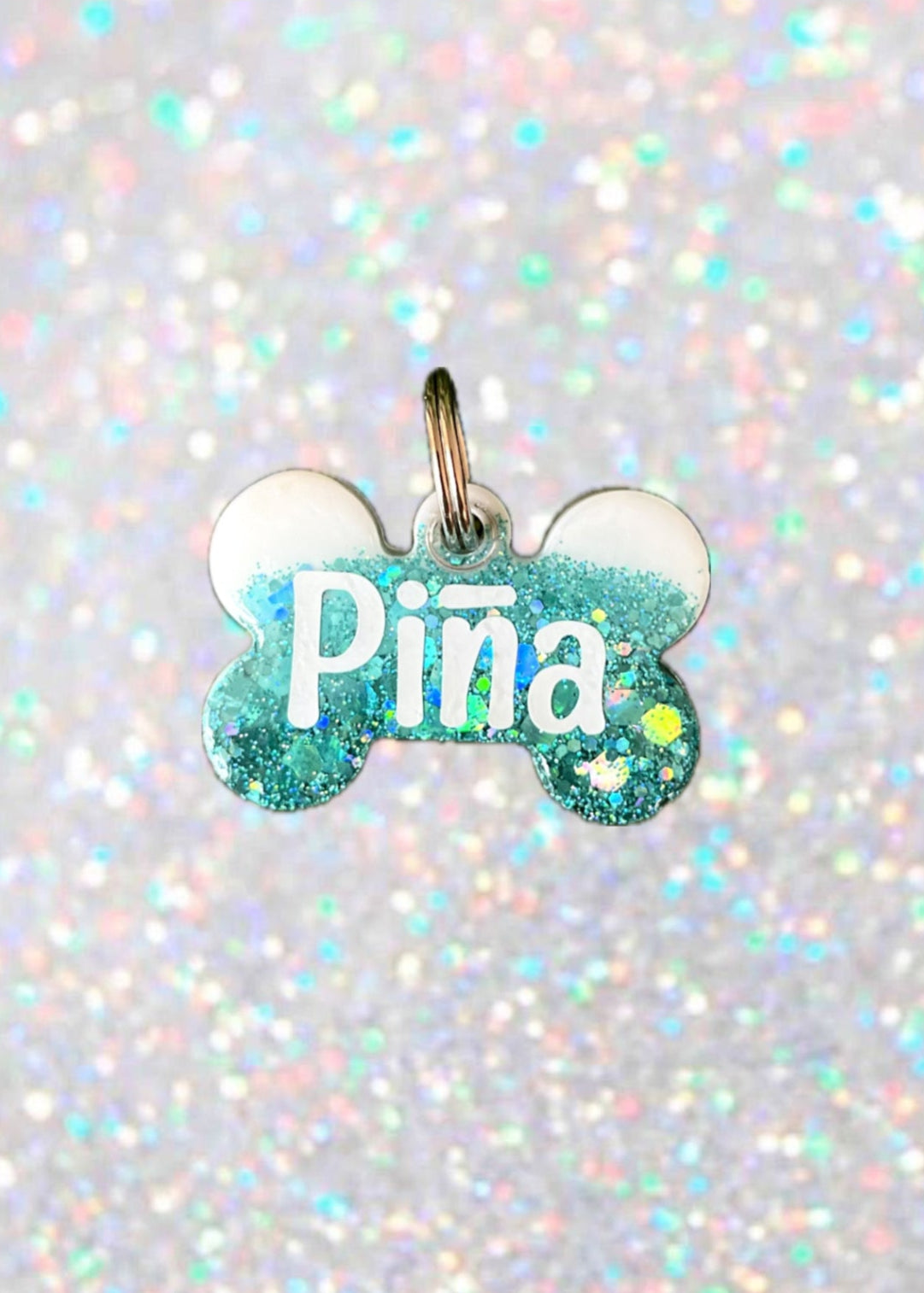 La chapita Esmeralda combina la pureza del blanco en la parte superior con un tono turquesa con destellos en la parte inferior. Un diseño sofisticado y lleno de magia, hecho a mano con resina resistente al agua, pensado para que tu mascota siempre luzca única y segura.